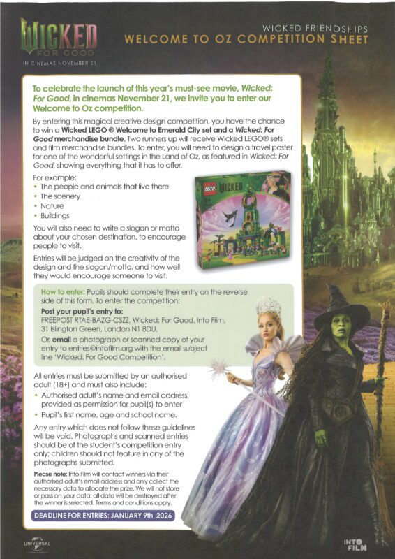Mrs Ellis has secured a maximum of 140 entries for the nationwide ‘Welcome to Oz’ poster competition. Any students who wish to enter should see Mrs Ellis in S4a to obtain an entry form. There are three prizes up for grabs including a Wicked merchandise bundle and Lego Emerald City set. The closing date is 9 January 2026. The challenge is to design a poster for the land of Oz, using visuals and a slogan, to encourage people to visit Oz.