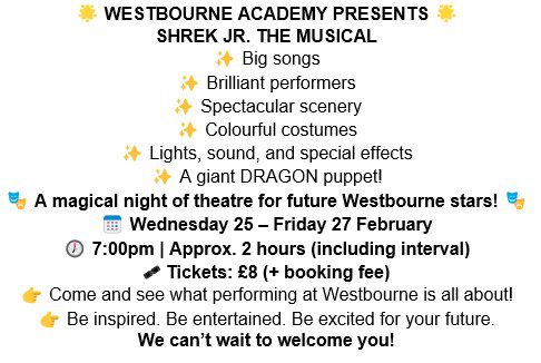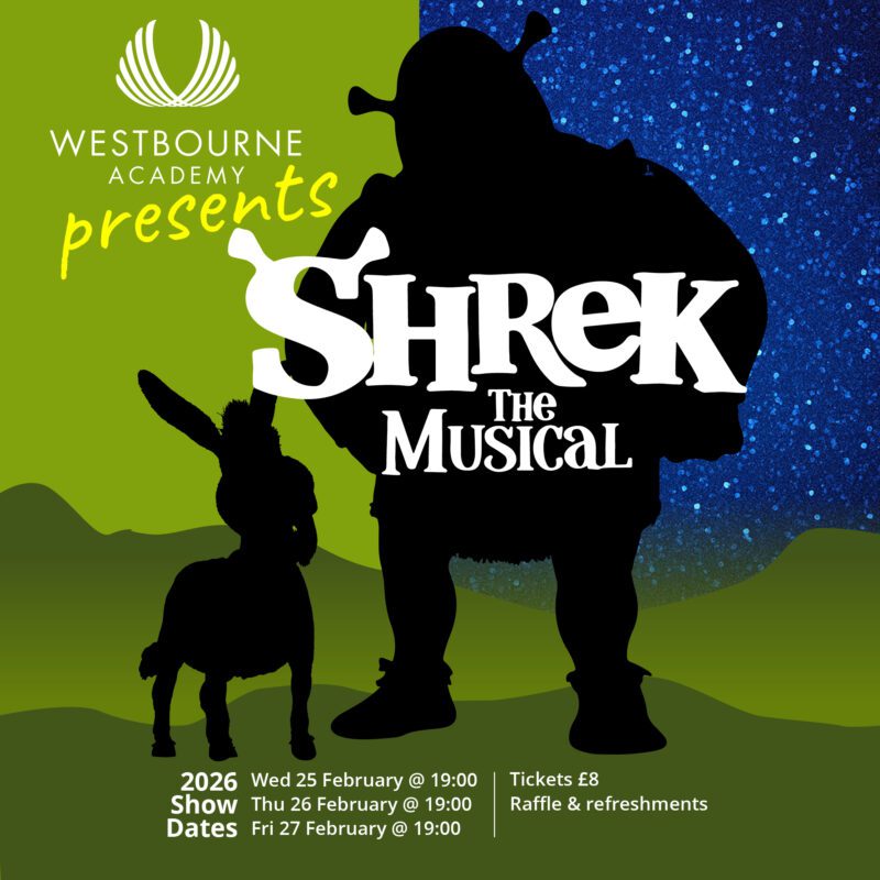 Tickets for our academy production of Shrek the Musical are now on sale at a cost of £8 per person. They can be purchased online through Ticketsource: www.ticketsource.co.uk/westbourne-academy-att